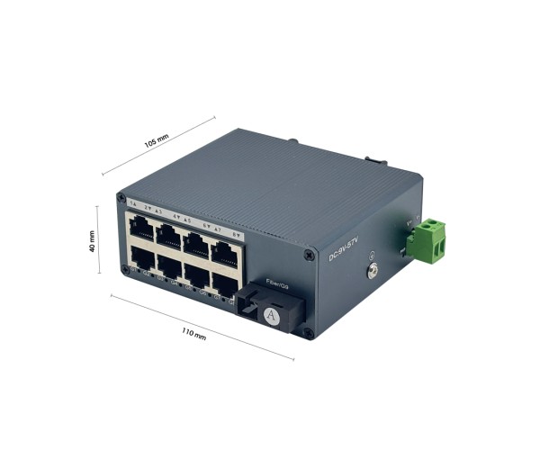Mini Industrial Gigabit Fiber Media Converter | 1 SC (WDM A) + 8 LAN | 20km | DC 9-57V | DIN-Rail