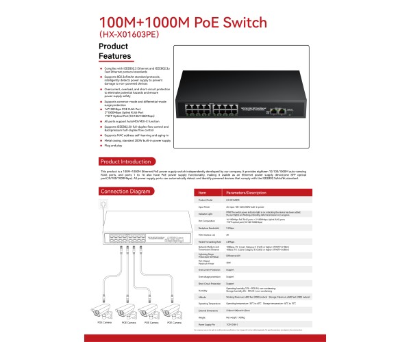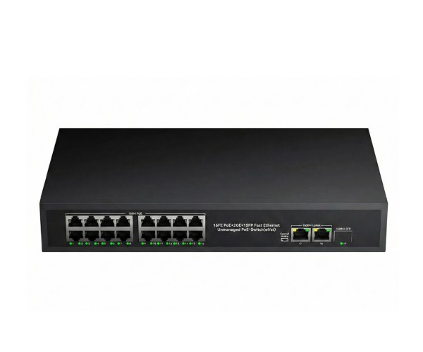 tags : poe switch 16 port, 16 port poe switch, 10/100 poe switch, 2 gigabit uplink, 1 sfp port, sfp uplink, 200w poe, 802.3af, 802.3at, poe+, cctv poe switch, switch for ip camera, unmanaged poe switch, surge 4kv