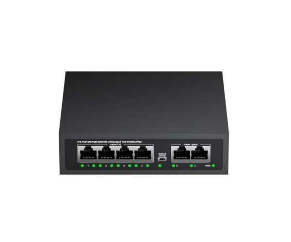 สวิตช์เครือข่ายสำหรับงานกล้องวงจรปิด/ระบบเน็ตเวิร์กแบบ Plug & Play มาพร้อม PoE 4 พอร์ต สำหรับจ่ายไฟให้กล้อง IP, Access Point หรืออุปกรณ์ PoE อื่น ๆ และมี Uplink 2 พอร์ต สำหรับเชื่อมต่อไปยัง Router/NVR/สวิตช์หลัก เหมาะสำหรับการติดตั้งหน้างานที่ต้องการความเสถียรและใช้งานง่าย