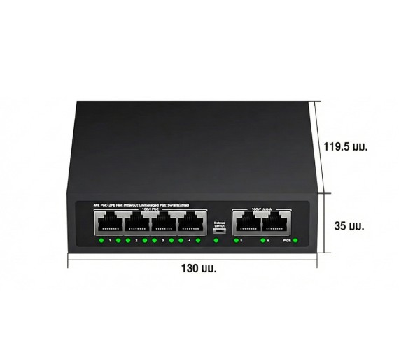 | โครงสร้างพอร์ต | 4× PoE (Port 1-4) + 2× Uplink (Port 5-6) |